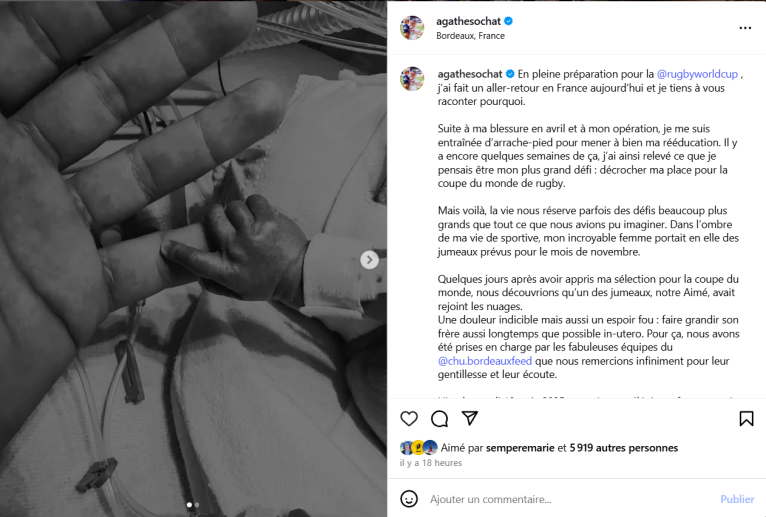 Dans son post émouvant, Agathe Gerin a aussi tenu à couper l’herbe sous le pied d’éventuels commentaires malveillants qui la questionneraient sur sa capacité à gérer de front ce tsunami d’émotions et la Coupe du monde qui l’attend.