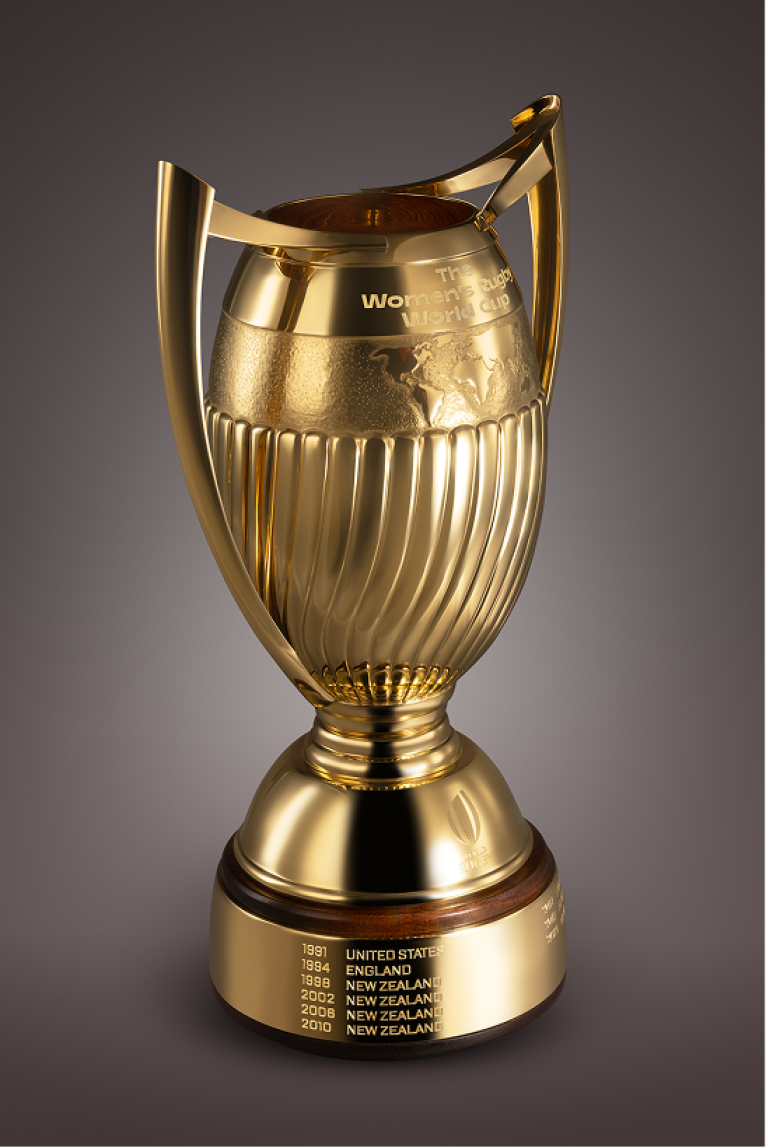 Fabriqué en argent massif et plaqué or 24 carats, le nouveau trophée de la Coupe du monde de rugby féminin se caractérise par sa forme ovale élégante et se veut un symbole de modernité, de réussite et de passion. Ses deux poignées emblématiques ont été conservées. A sa base sont gravés les noms des nations victorieuses précédentes, en hommage aux championnes qui ont marqué l’histoire du rugby féminin et pour inspirer les générations à venir.