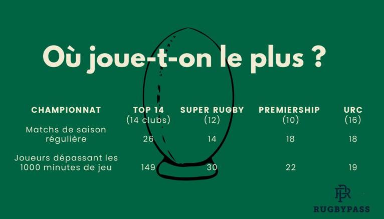 Le Top 14 propose presque deux fois plus de matchs que le Super Rugby Pacific, et s’étale sur une durée deux fois et demie plus longue. Le championnat de France comporte également huit matchs de plus que la Premiership anglaise et que le United Rugby Championship (URC), qui regroupe des équipes irlandaises, galloises, écossaises, italiennes et sud-africaines.