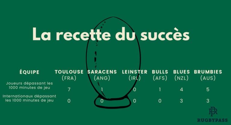 Si l’on prend les clubs dominants de chaque championnat majeur, on constate que le Stade Toulousain, auteur du doublé Top 14 – Champions Cup, ne compte que sept joueurs au-dessus des 1000 minutes, loin de la moyenne précédemment citée.