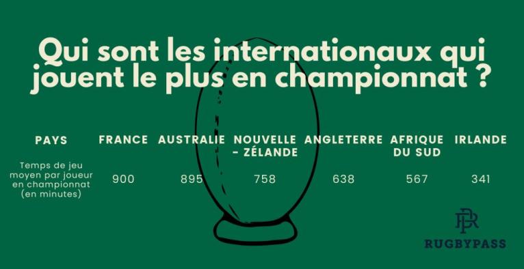 Le dernier tableau met en lumière le temps de jeu moyen par joueur durant la saison régulière, en prenant le probable XV de départ des six nations majeures représentées dans les championnats étudiés.