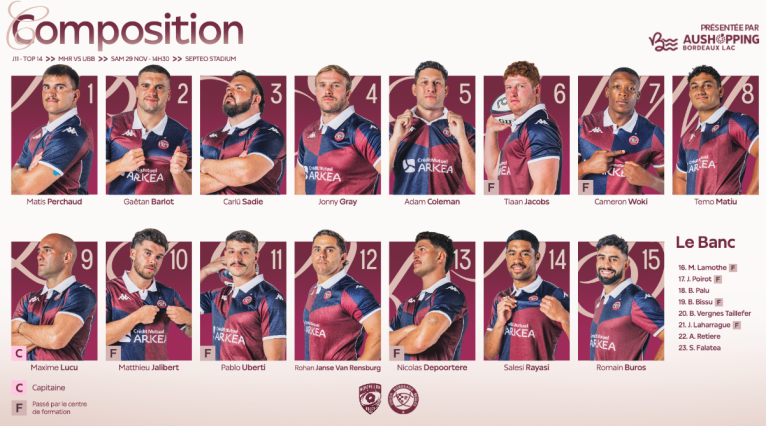 La composition d’équipe prête à défier @LeLOURugby1, samedi au stade Jean-Dauger à 16h35.