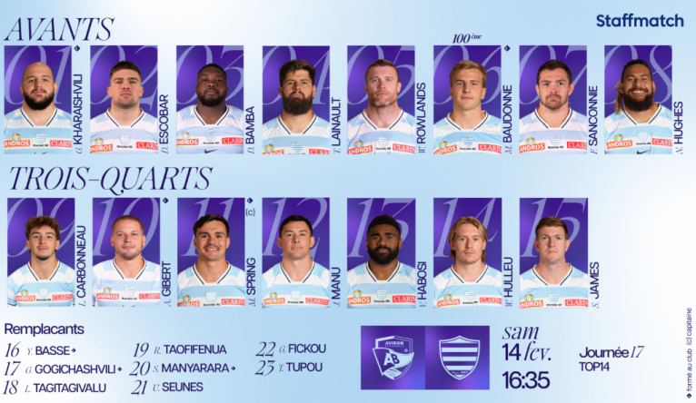 La composition d’équipe pour la réception du Racing 92 au Stade Jean-Dauger, avec un coup d’envoi à 16h35.