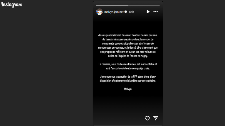 Plus tard dans la soirée, le joueur s’excusait sous forme de story postée sur son compte Instagram : « Je suis profondément honteux de mes paroles », est-il écrit. « Je tiens à m’excuser auprès de tout le monde. Je comprends que cela ait pu blesser et offenser de nombreuses personnes et je tiens à dire clairement que ces propos ne reflètent en aucun cas mes valeurs ou celles de l’équipe de France de rugby.