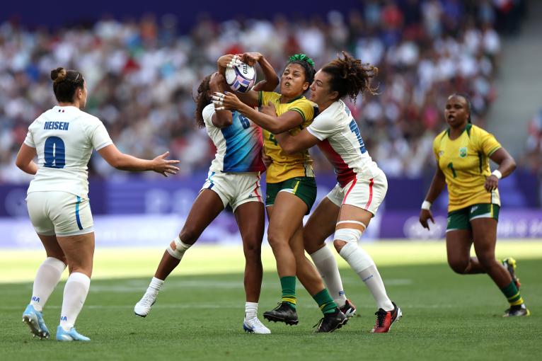 L’Afrique du Sud, qui participe pour la première fois aux Jeux olympiques, a eu du mal à exister et à développer son jeu face aux grandes favorites du tournoi. Après quatre matchs consécutifs sans marquer, Nadine Roos a réussi à inscrire un essai, profitant d’une supériorité numérique due à l’exclusion de Kaitlin Shave, blessée lors de son plaquage haut.
