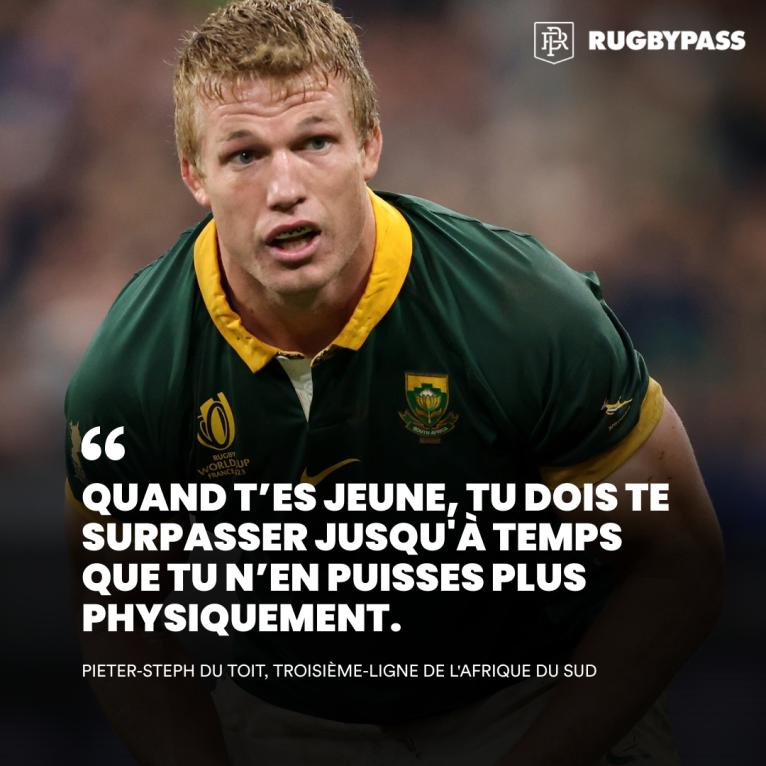 En Angleterre, Pieter-Steph Du Toit disputera quatre matchs. Il sera sacré champion du monde en 2019 au Japon puis en 2023 en France. Toute sa vie a été tournée vers la performance en dépit de ses problèmes de santé comme en 2020 où un hématome à la jambe a failli conduire à une amputation.