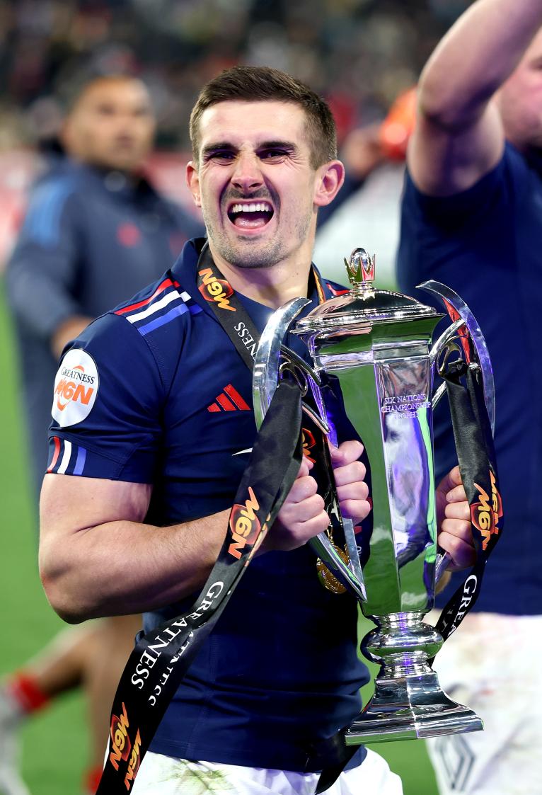 Le Français Thomas Ramos célèbre avec le Trophée du Tournoi des Six Nations après le match du Tournoi des Six Nations 2025 entre la France et l'Écosse au Stade de France le 15 mars 2025 à Paris, France. (Photo par Warren Little/Getty Images)