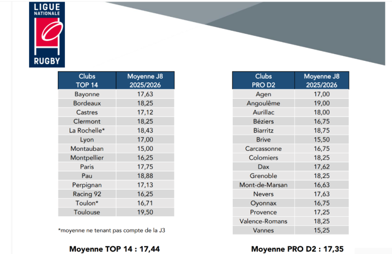 À noter que Brive, plus gros budget de la Pro D2 et qui aspire aussi à monter malgré sa décevante 8e place actuelle, est l’autre mauvais élève de ce classement, avec une moyenne de 15,50, assez loin derrière la moyenne de la division qui atteint 17,35 JIFF par feuille de match.