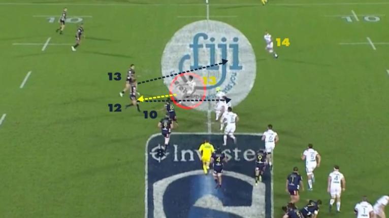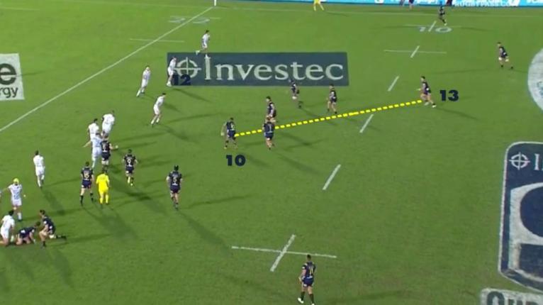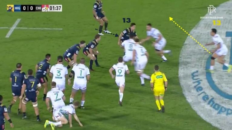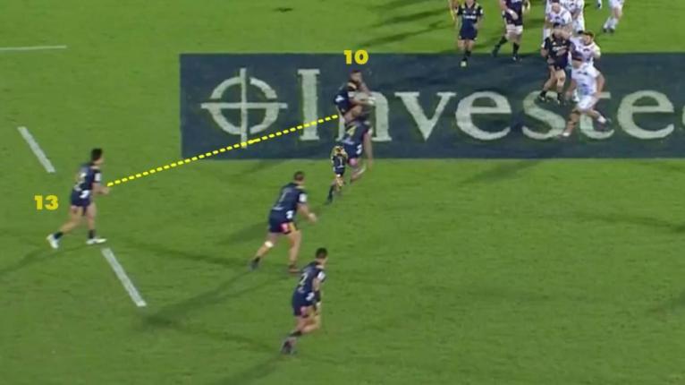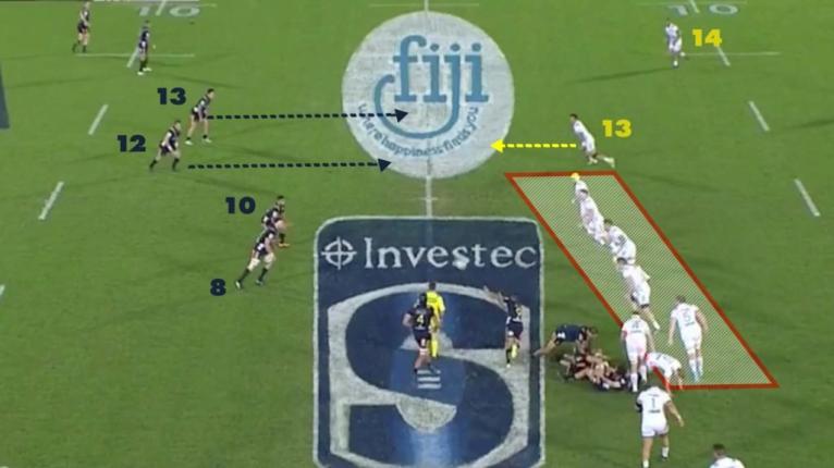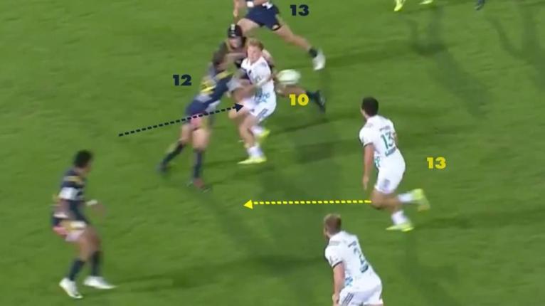 In this movement, we see the chemistry between Sopoaga and Thompson. Following a long break or momentum play down the sideline, Sopoaga often likes to shift wide to the opposite touchline immediately using his centre out the back, which is quite common in Highlanders play.