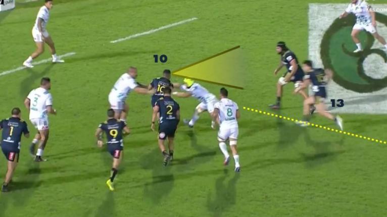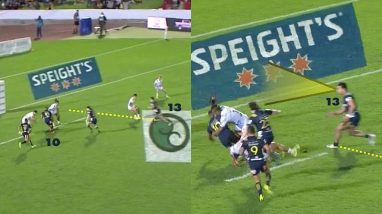 Lienert-Brown opts to shut down the closest threat in Walden (12), which opens up the lane for Thompson to slip through. Chiefs winger Pulu (14) doesn’t stay connected, leaving a canyon-sized hole in the line. Sopoaga makes the right call and hits Thompson on the chest for a line break.