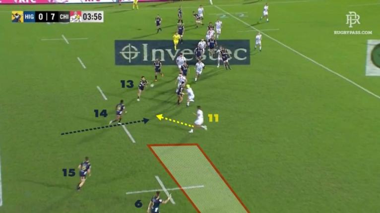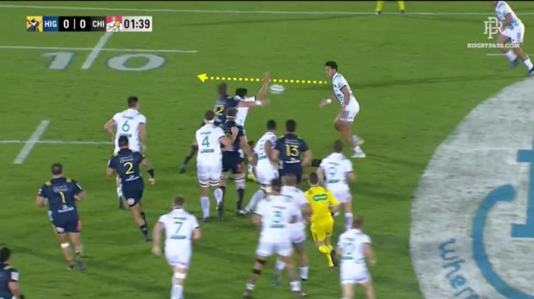 Thompson’s slow start continued when he missed a golden opportunity to strike back with this overlap. He makes a great read identifying the space over the top as Chiefs winger Wainui (11) shows interest in Waisake Naholo (14). The long pass is difficult to execute against the cyclonic Fijian wind and hits the turf at Dixon’s feet (6), resulting in a knock-on.