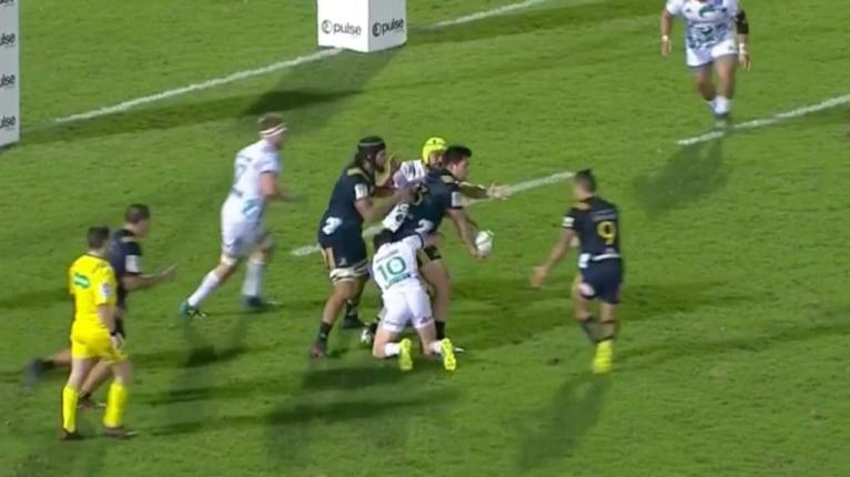 As the Highlanders finally find some momentum, quick wide ball to Thompson out the back results in the centre breaking through and scoring a brilliant individual try. Unfortunately, it is called back for a knock-on on the previous phase, robbing him of the moment.
