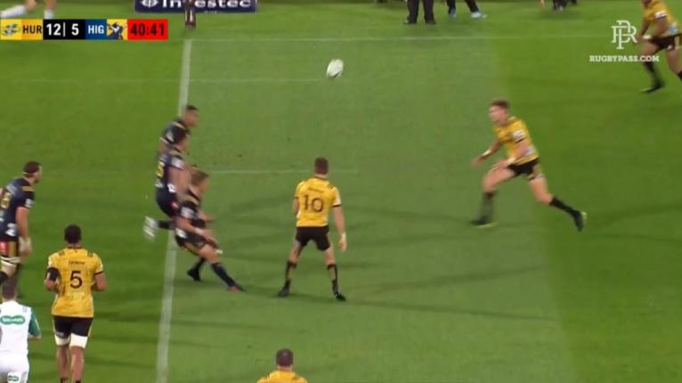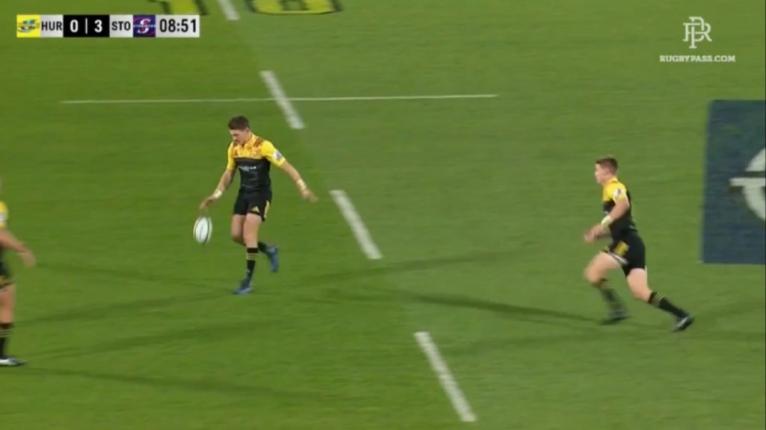 Leyds frantically sprints back to cover the space but the Hurricanes recycle is too fast. The call has been made and Barrett puts the ball on the money in the exposed edge channel, hitting Cory Jane on the chest for five points.