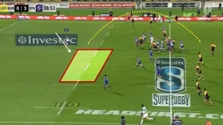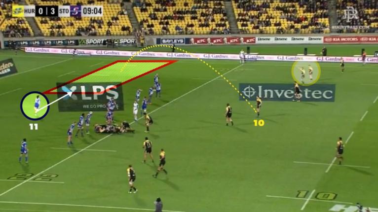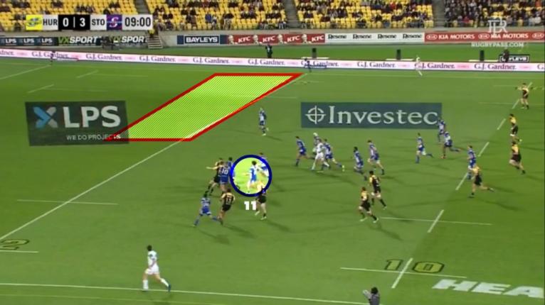 This situation is one the Hurricanes carefully plan to deliberately get ex-NRL winger Ngani Laumape onto the edge. We can see Laumape turn his back on the exit kick and make a beeline for the opposite touchline when retreating, setting himself up for a few phases later.