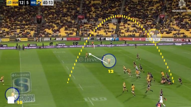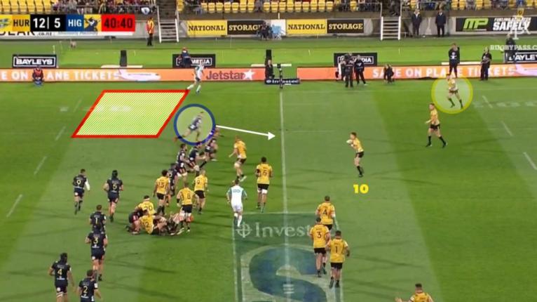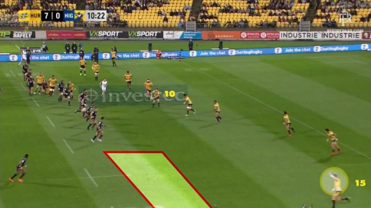 The Hurricanes also used the wipers option from set-piece for a one-on-one aerial contest, positioning the winger right on the touchline to get an isolated matchup. This was more of a calculated gamble, using a big man like Savea in the air against another winger.