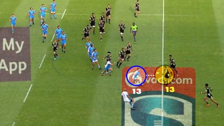 The sole play used with Kriel as a flat option outside 12 resulted in Kriel getting a mismatch on the flyhalf West, shaking him off and making a clean break.