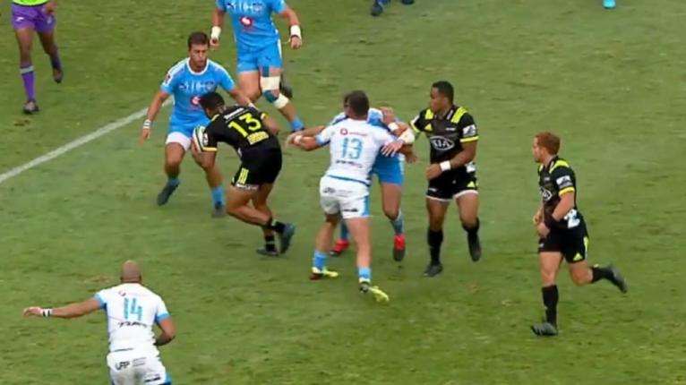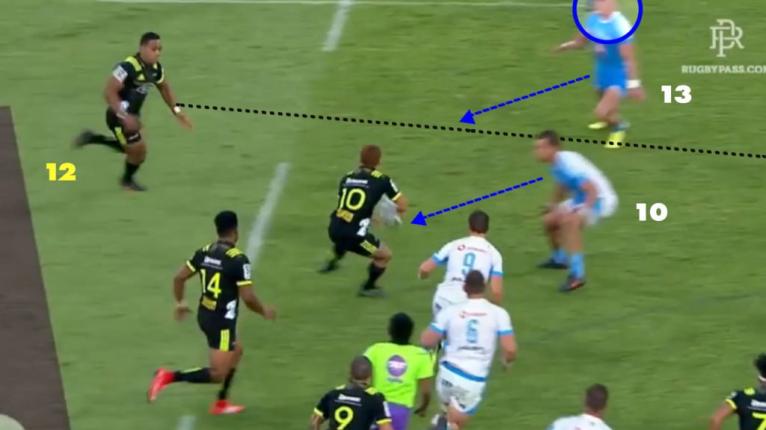 On this midfield scrum, Ihaia West does a successful job of getting outside the 9 and engaging Handre Pollard (10) into contact. The Bulls need to employ a slide defence to cover man-for-man all the Hurricanes players to that side. Pollard breaks ranks and engages with West – his original assignment is pushing out to cover Ngani Laumape (12).