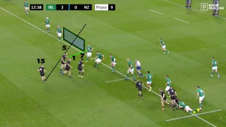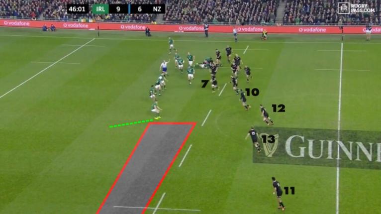 With Garry Ringrose biting down, if Squire is able to play Barrett out the back the All Blacks would have an opportunity down the left edge with Rieko Ioane out of shot, even with McKenzie having to recover.