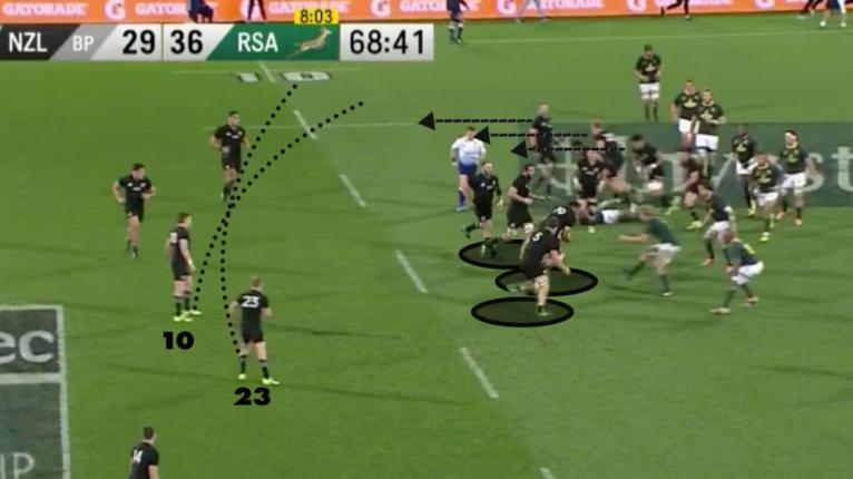 This was one example of the type of switch plays the All Blacks used to target the Springboks off scrums. In the second half, they used a complex ‘tack’ play, switching the point of attack after a lineout.