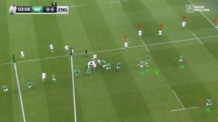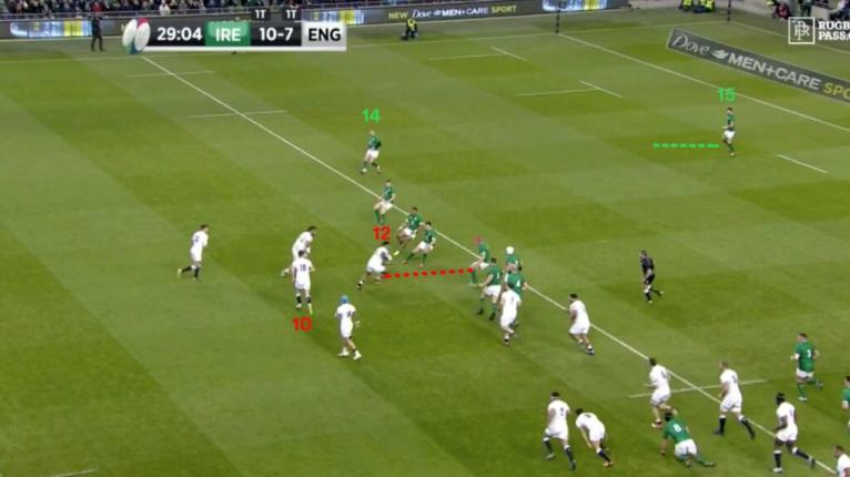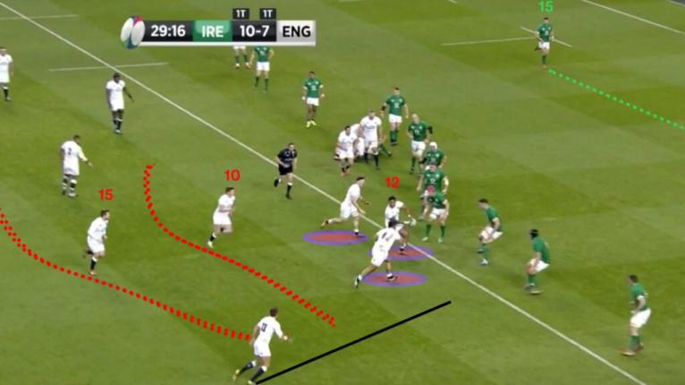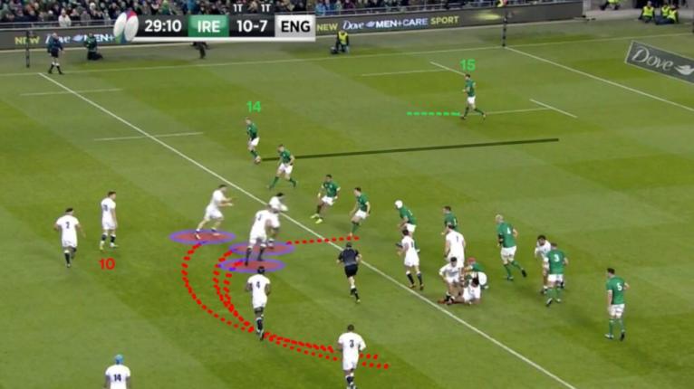 Billy Vunipola’s offload allows England to attack without Ireland’s defence set, which is also a factor. Murray is still backtracking into position as Youngs receives the ball and is almost in the pocket of Garry Ringrose (13).