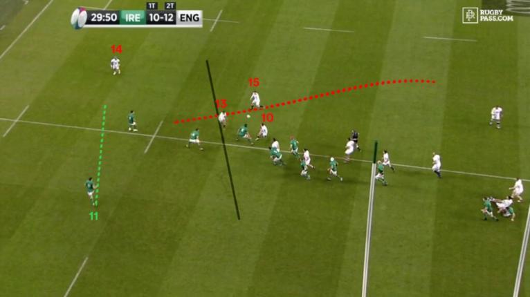 On the third phase England run the switch, Owen Farrell (10) and Elliot Daly (15) pivot and streak across to the open side, getting a 15-metre horizontal head start on Henshaw at the top of the screen.