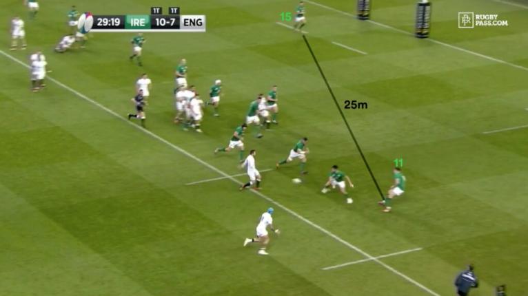 The pass beats Earls and leaves Ireland compromised, Daly streaks down the corridor and England skin them down a 3-metre channel.