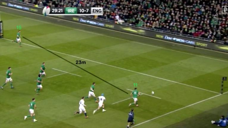 All of Murray’s exit box kicks in the first half were long, either directly into touch or uncontested as a result of the deep kick-offs. This took away Ireland’s own contestable aerial game and protected fullback Elliot Daly from receiving a high ball barrage.