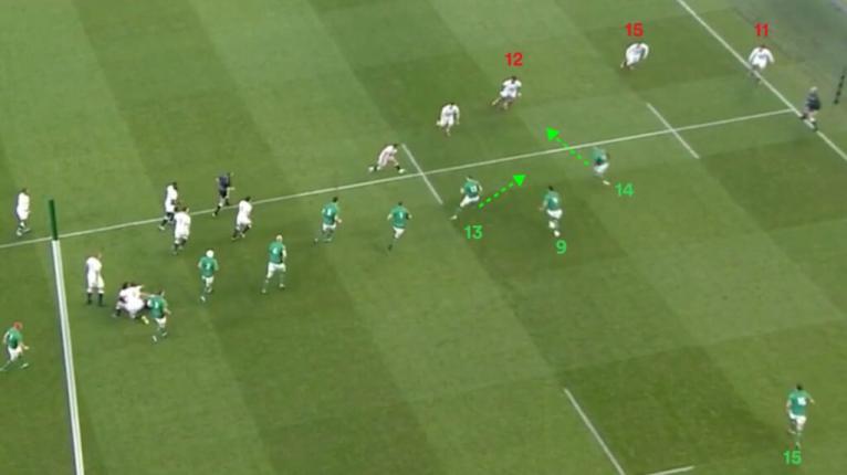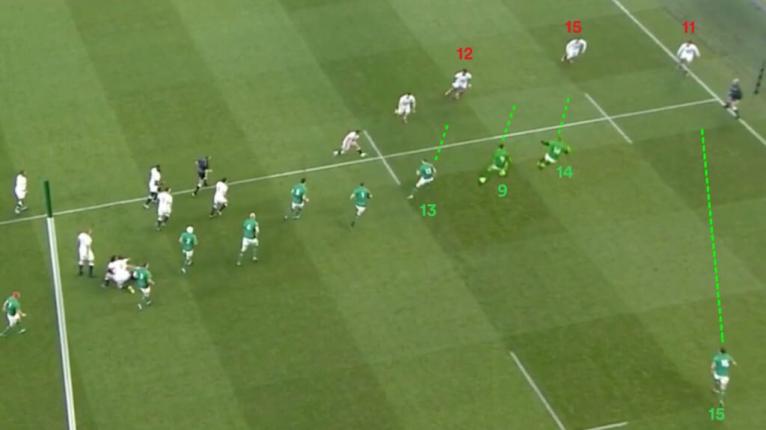 The pass to Daly starts to bring Jacob Stockdale (11) up into the line, who has the assignment of last man Jack Nowell (14).