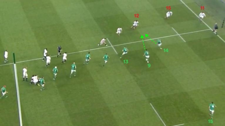 Ireland has the numbers to cover Nowell with Conor Murray (9), the last defender on the edge, but there is a communication breakdown and Stockdale comes up anyway, leaving space in behind.