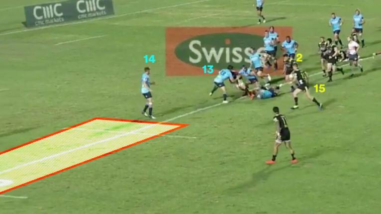 The Waratahs are in desperate need of open side defenders, so they ideally want Ashley-Cooper to reset. Being the closest man to Alex Newsome (14), he can get there fastest.