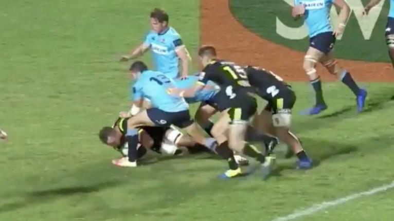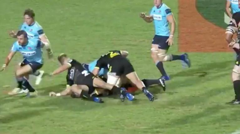 After two or three phases from the set-piece, the Waratahs are under pressure to fold, but Adam Ashley-Cooper is caught up ensuring that the latest runner is down.