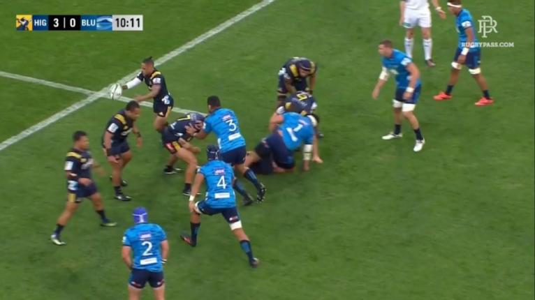 The Blues are catfished when Thompson puts in an unexpected chip kick over the top. Pulu is unable to secure the bouncing ball for the Blues and it sits up perfectly for Walden who scores a crucial try for the Highlanders.