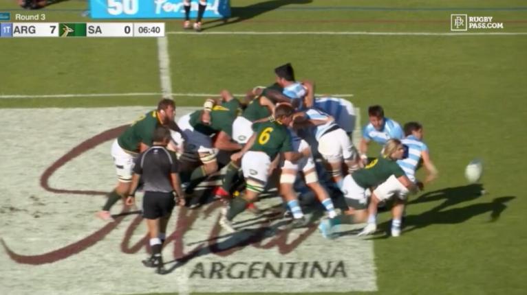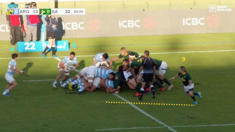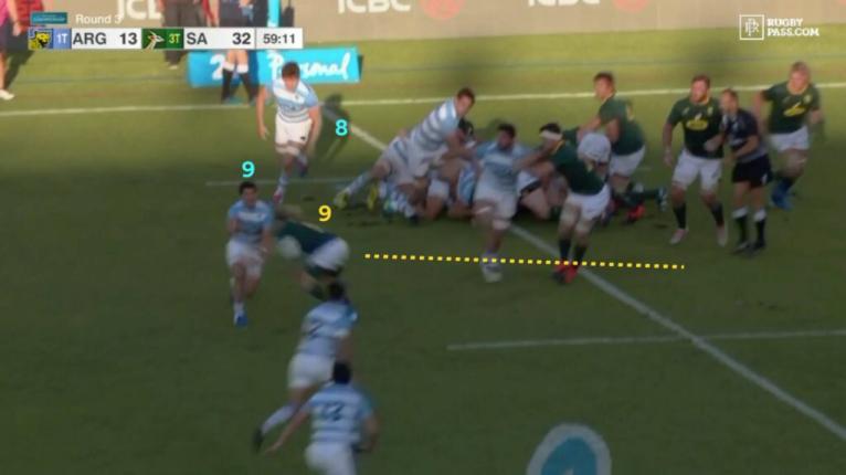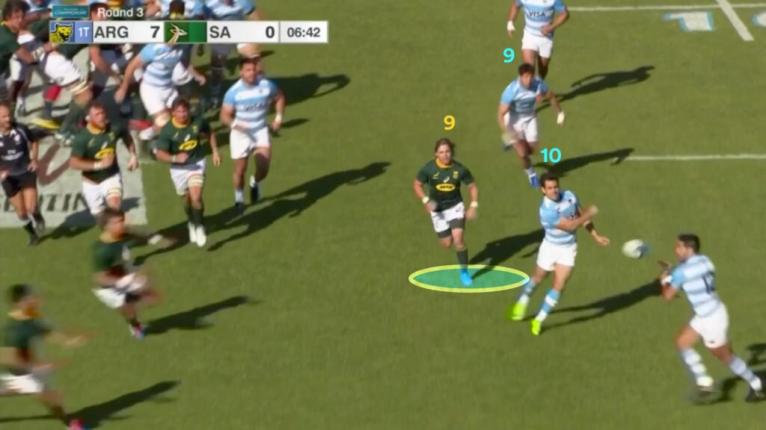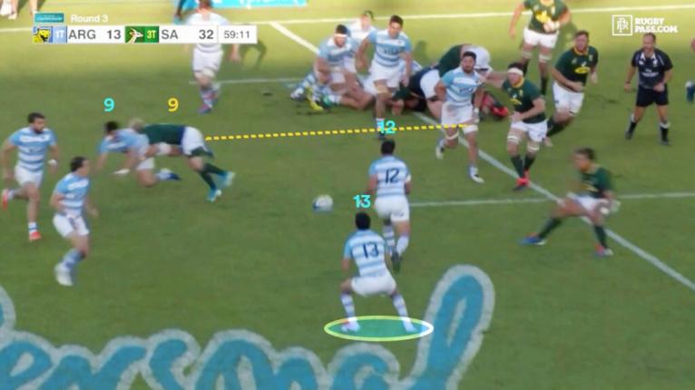 The resulting ‘lollipop’ pass sails behind inside centre Jeronimo de la Fuente (12) while Matias Moroni (13) has to completely stop and catch the ball facing the sideline, with the play dead and buried.