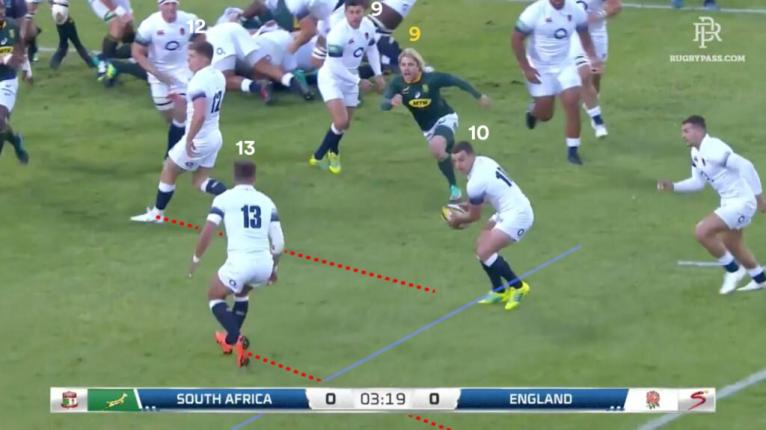 Ford (10) is stationary receiving static ball, throwing out Henry Slade’s (13) timing, who is now front-running the flyhalf.