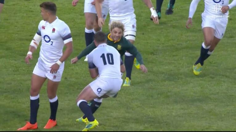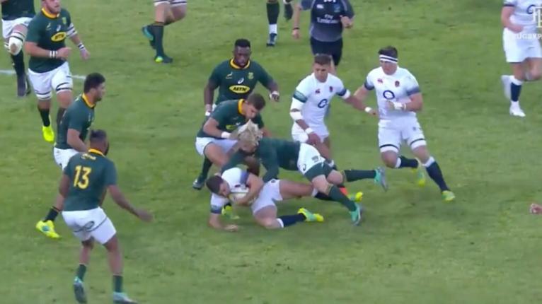 De Klerk blew the play up by forcing an early pass with pressure on Youngs which threw the timing out, but secondly by staying alive and continuing his path of destruction towards Ford, tackling him for a loss and putting England in a compromised position which should have led to a penalty.