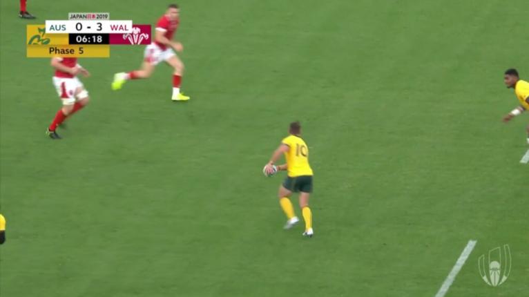 The forwards are late to form the pod, coming together after Genia has picked up the ball. Davies may have jumped the gun a little bit, but for Australia everyone is static waiting for a long pass to be delivered, floating through the air like a sitting duck.