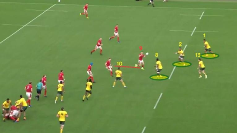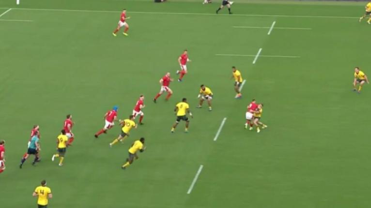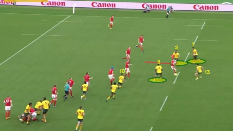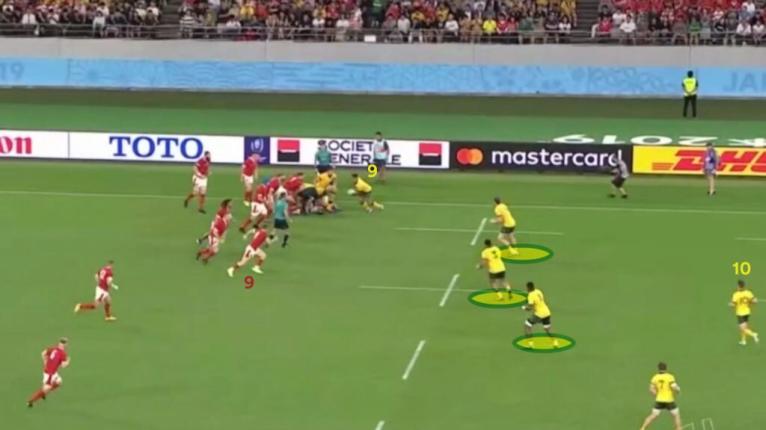 After a stretch to the sideline, the Wallabies bring play back right with a carry off nine, before setting up to play a second pod off 10 in a traditional 1-3-3-1 pattern.