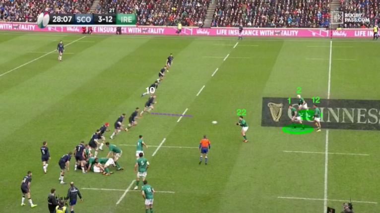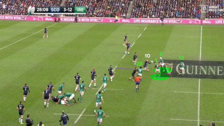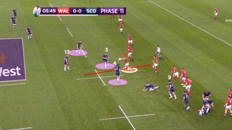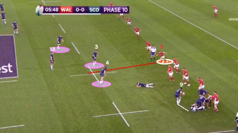 After Scotland go wide, they try to bring play back left to the 15 metre mark with a rather long pass from halfback Ali Price (9) to a pod of three forwards.