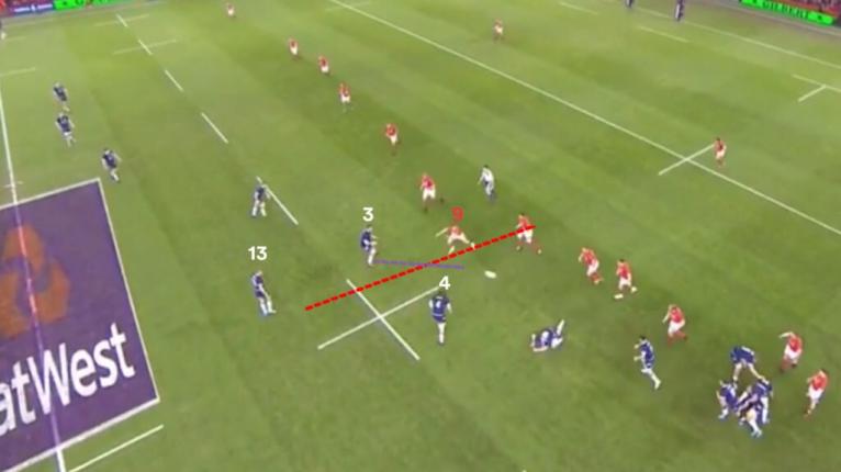 Foley delivers his pass with Davies bearing down at pace. He cuts off the passing lane to the intended target Tolu Latu (2), intercepting the pass. Only back-door receiver James O’Connor (13) prevents this from being more, making a crucial one-on-one tackle.