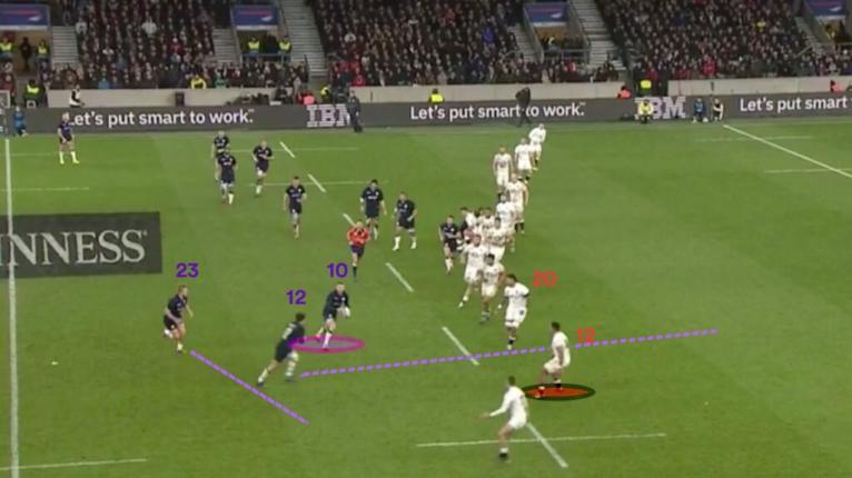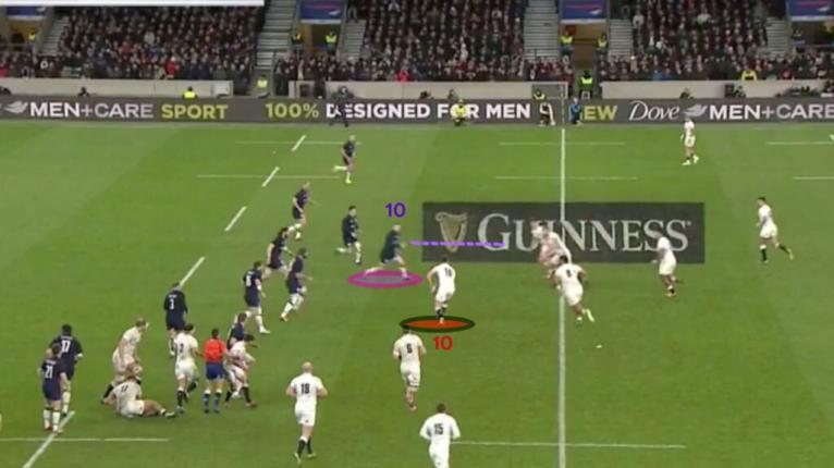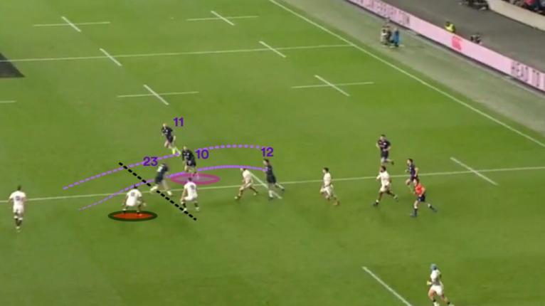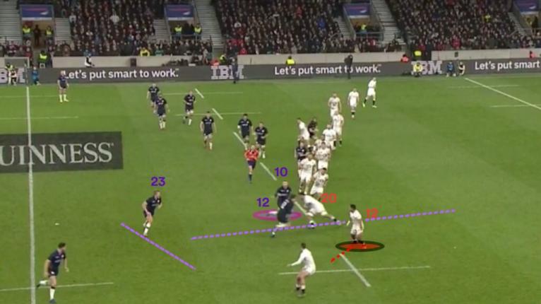 Russell found this same opportunity against England to free Sam Johnson (12). Working the same way after a few phases, this time Scotland had the ball-player in position on the edge to take advantage with Russell out on the fringes.