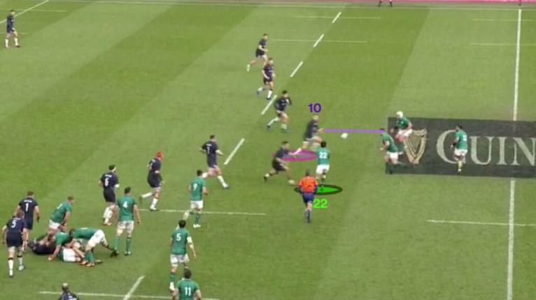 If Stuart Hogg looked to draw Bundee Aki (12) into contact on this example, with Jacob Stockdale (11) pushing out, Huw Jones (13) has a lane right to the try line. Instead, Hogg attempted to take Aki on the outside himself, running Jones out of room and is tackled.