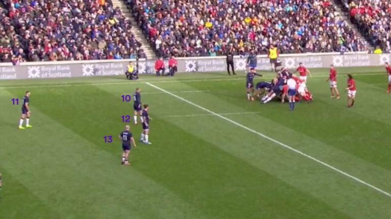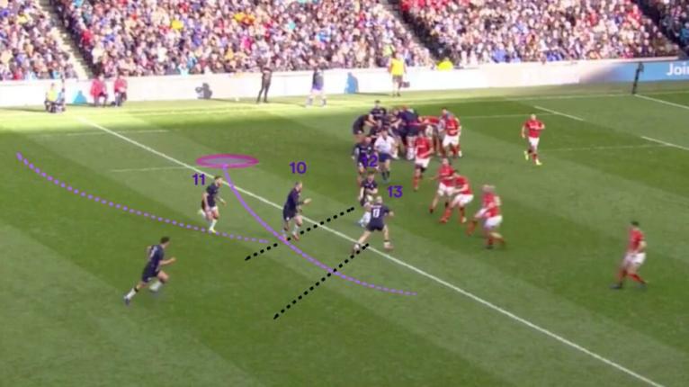 The setup from the lineout maul is a traditional 10-12-13 formation with Russell at first receiver. Halfback Ali Price feeds Peter Horne (12) one wider instead, with Nick Grigg (13) running a tight option line and Russell sweeping out the back.