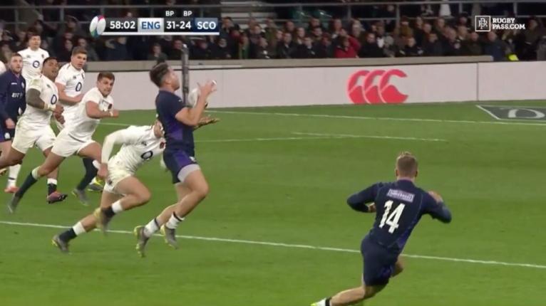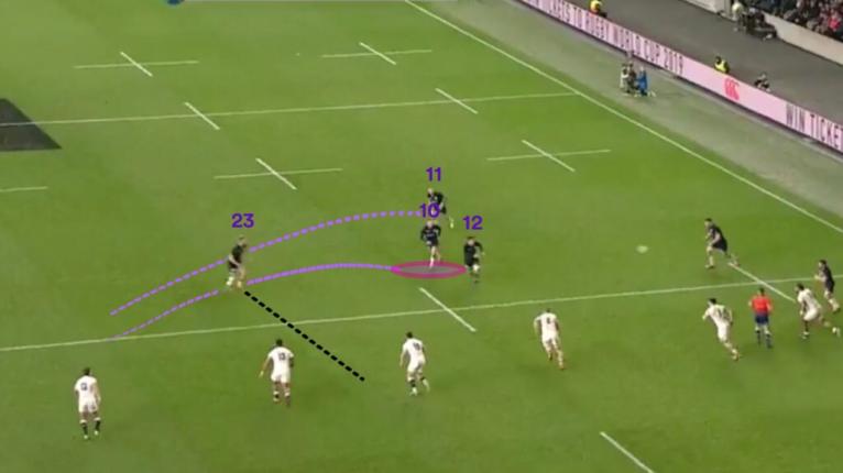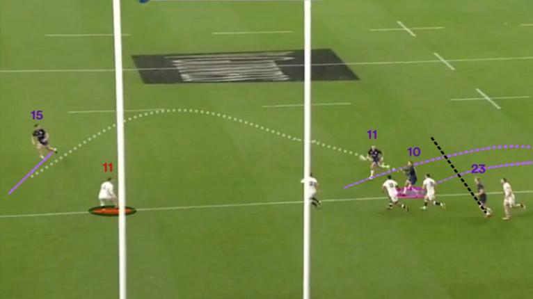 Russell senses that England have got narrow and he fires a long rainbow over the top to fullback Sean Maitland (15). This catches Jonny May (11) by surprise, who can’t recover in time after drifting inside his assignment.