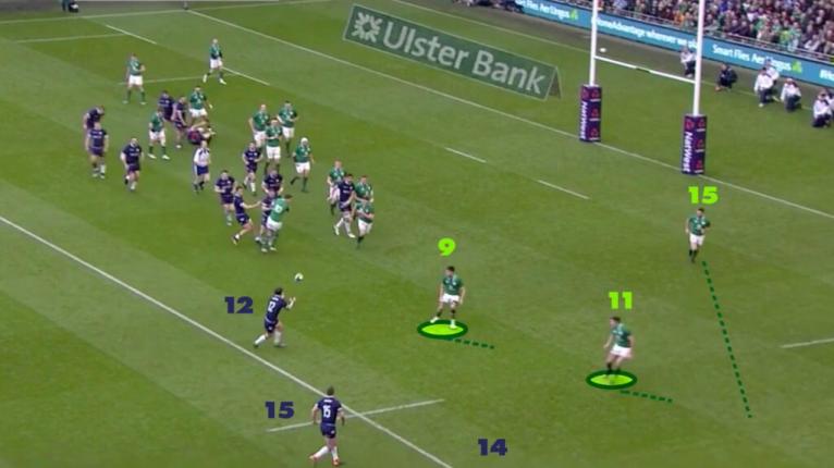 Scotland achieve a 20-metre gain on first phase but Irelandâs defensive line is pretty well set for the next phase. Everyone is set ready to now win back the yards from a far more manageable situation.