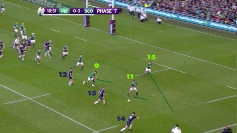 After six phases Scotland have created a numbers advantage on Irelandâs left edge towards Stockdaleâs wing.