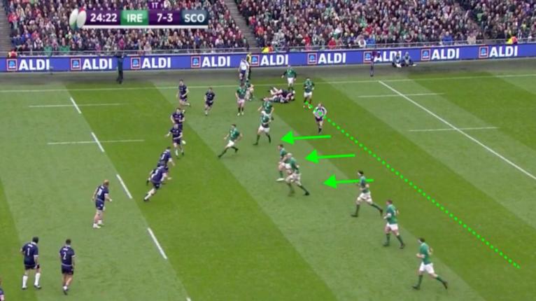 Irelandâs forwards chew up the space by pressing off the line on the second phase and Scotland achieve a 5-metre loss.
