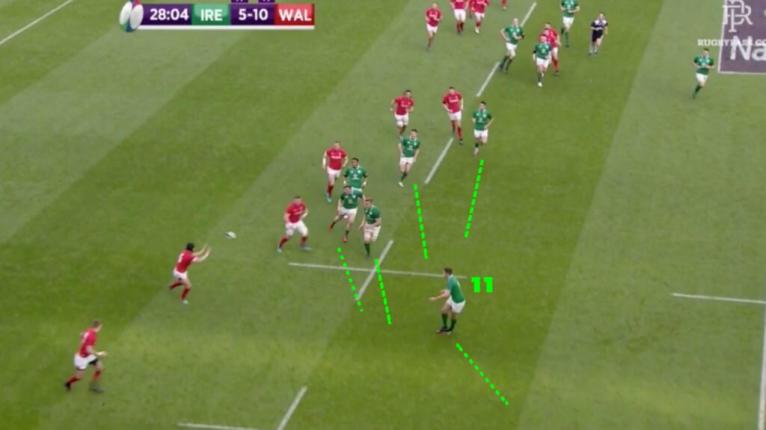 Ireland does usually bring line speed but typically play up-and-out defence. In some cases, they will automatically default to a slide defence to account for a numbers disadvantage.
