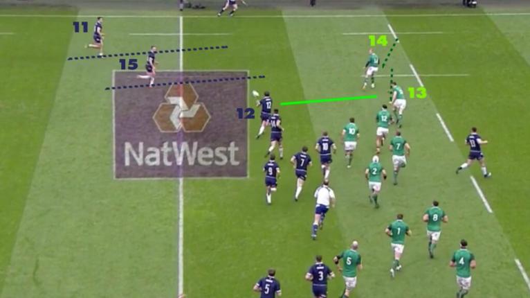 After six phases Scotland have created a numbers advantage on Irelandâs left edge towards Stockdaleâs wing.