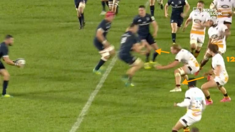 Wasps inside defenders Carr and Taylor are locked in on their first reads, and Taylor in particular, bites and prepares to tackle his first assessed target Conan.