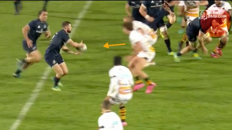 Sexton releases the pass to Henshaw out the back. There is plenty of time for Taylor to adjust but he commits to tackling Conan without the ball, which now puts Leinster’s play in motion to open up a hole.
